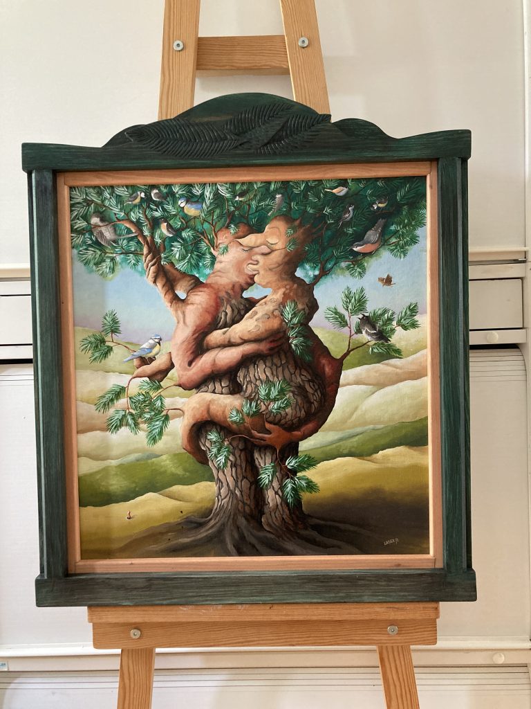 Olja på duk. 14 000:- Träd och tallar med fåglar, Blåmes, Talgoxe, Lappmes, Kärrmes, Sångare, Flugsnappare, Nötvecka, Kärrhök, Skatunge och...