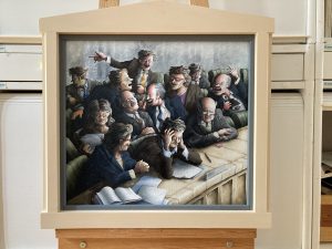 Olja på duk. 14 000:- Träd och tallar med fåglar, Blåmes, Talgoxe, Lappmes, Kärrmes, Sångare, Flugsnappare, Nötvecka, Kärrhök, Skatunge och en Daggmask.
