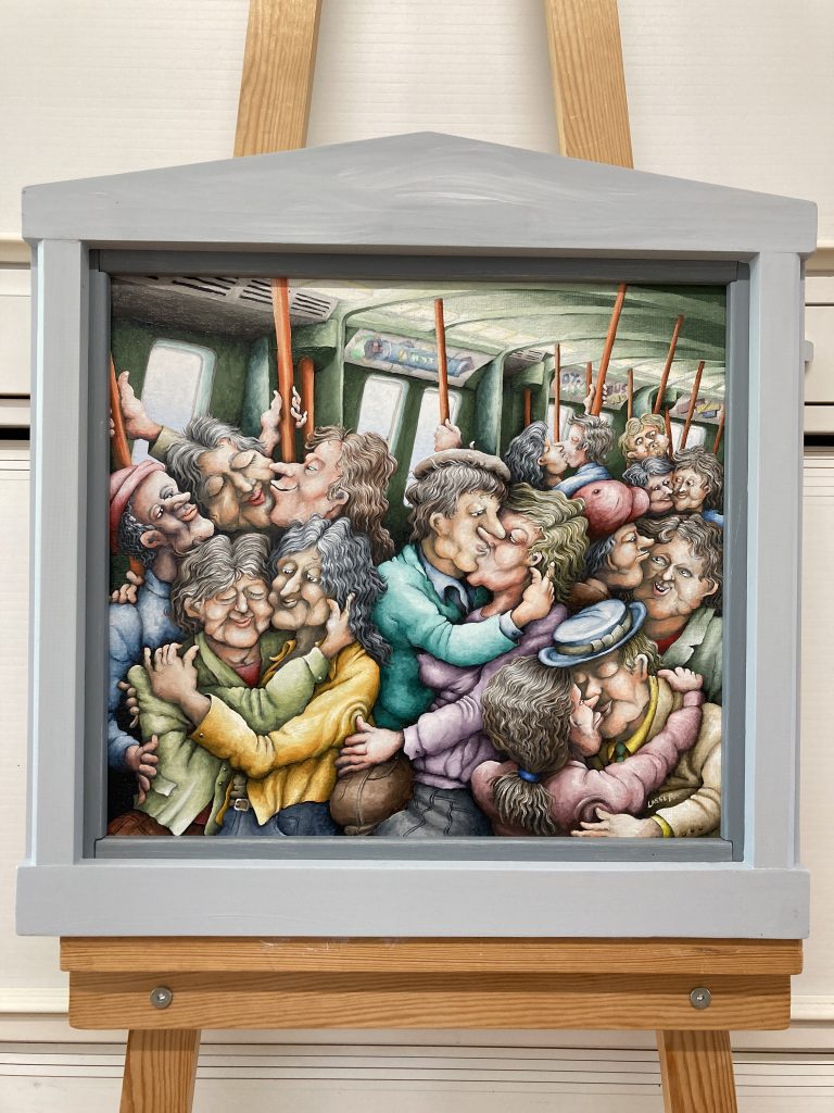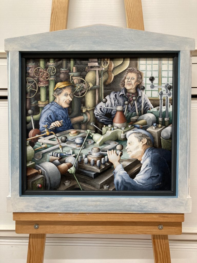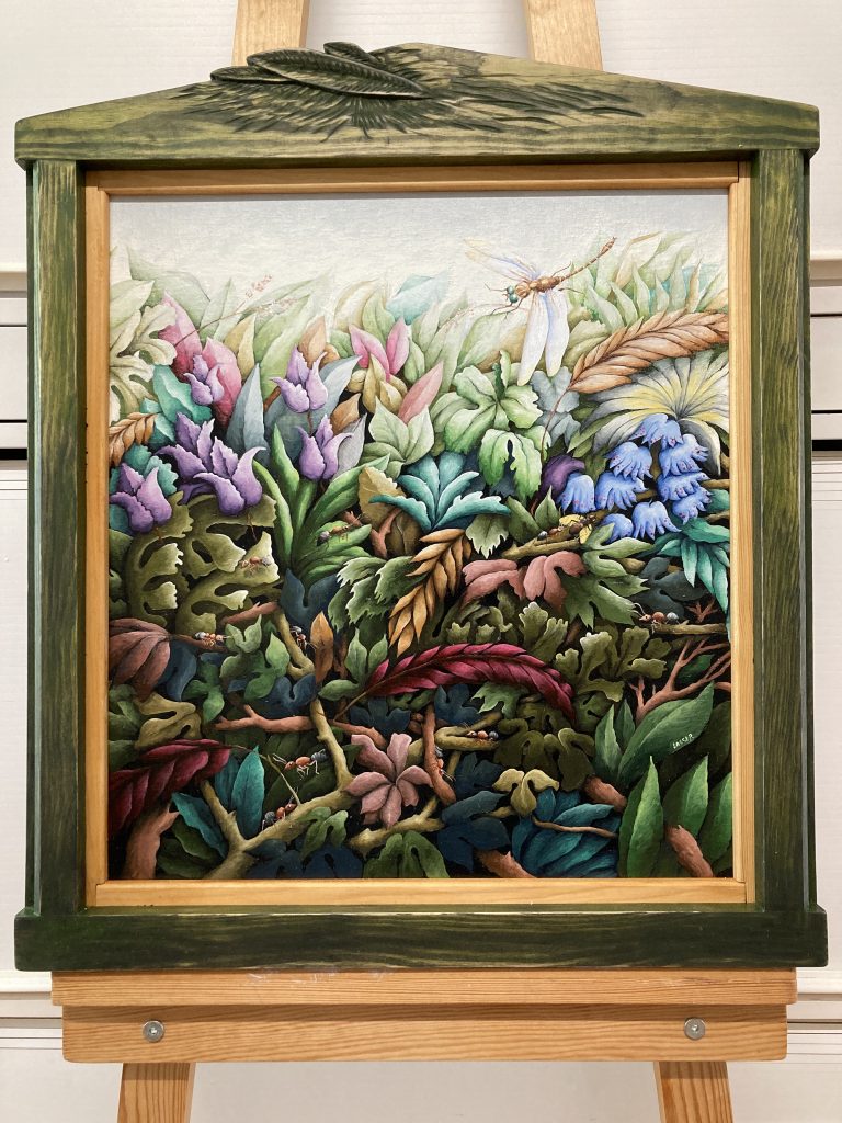 Olja på duk. Pris: 6 000:- En grönska med en Kungstrollslända, rödmyror och en husfluga.