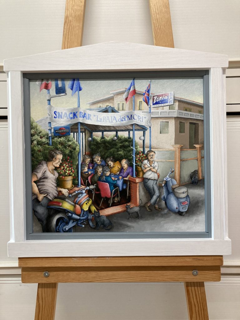 Olja på duk. Pris: 4 000:- Utsikt genom fönstret till en god pastalunch restaurant i milano.