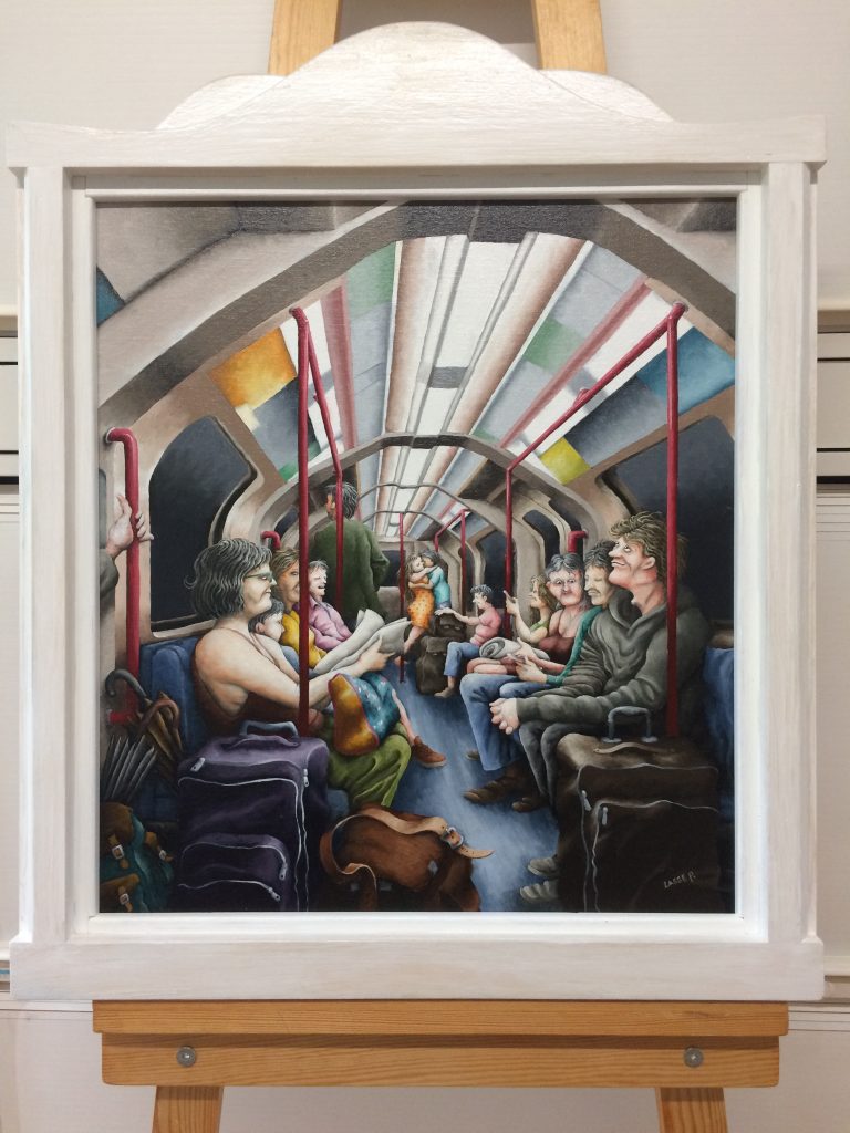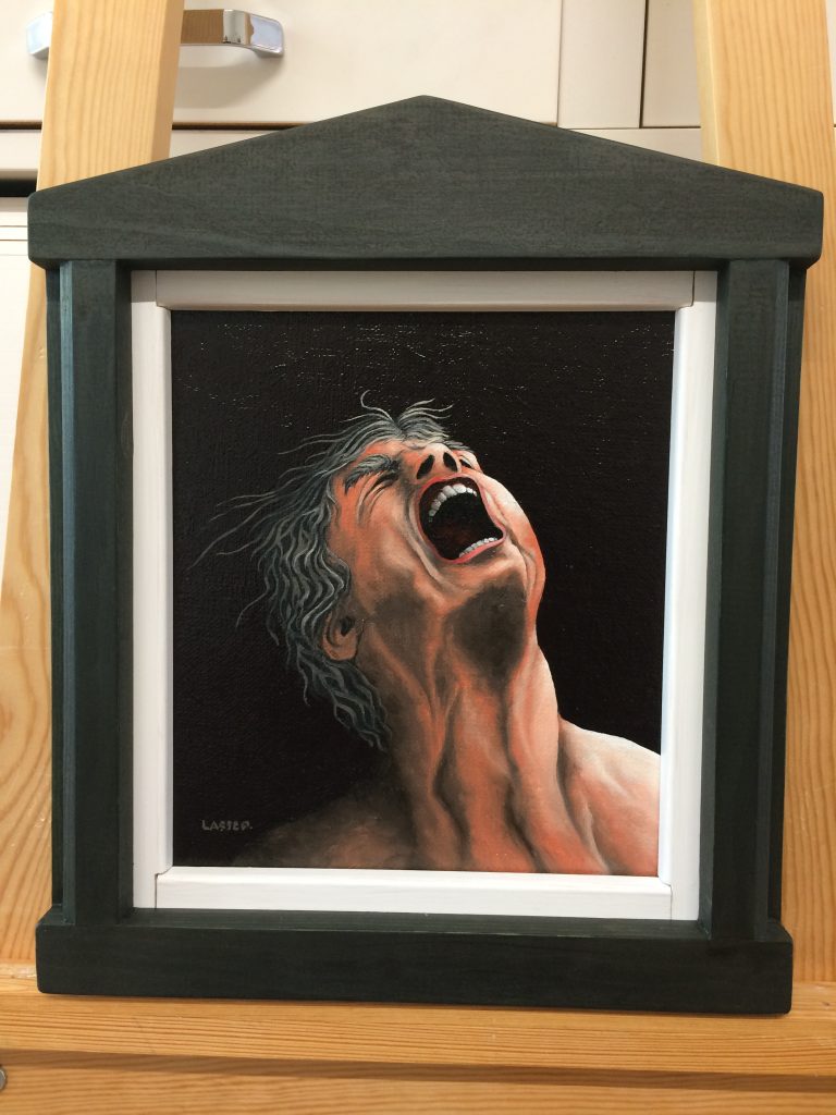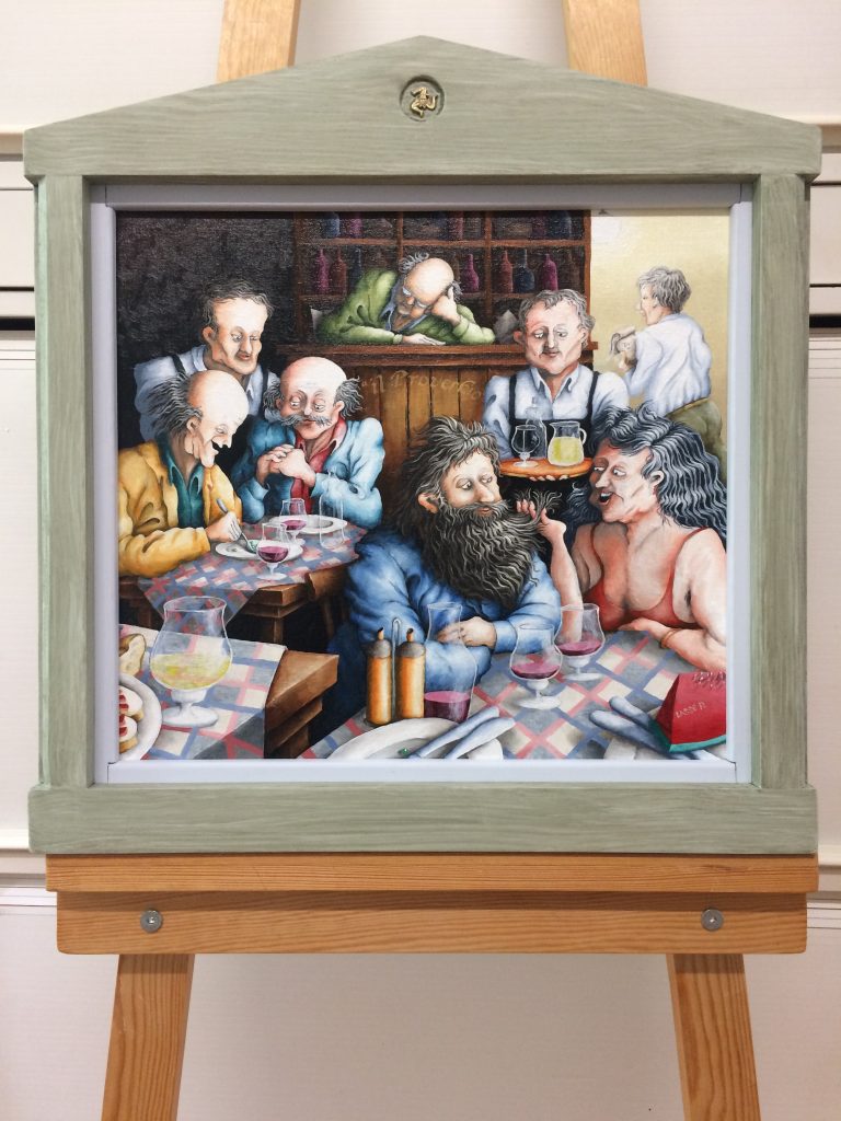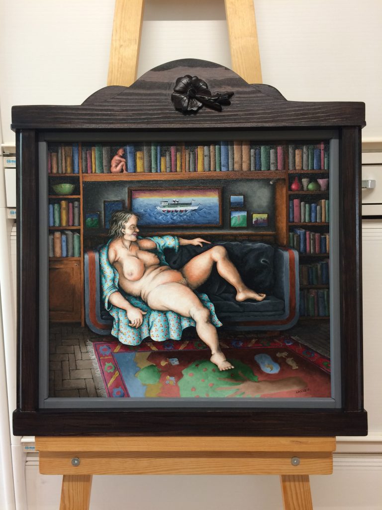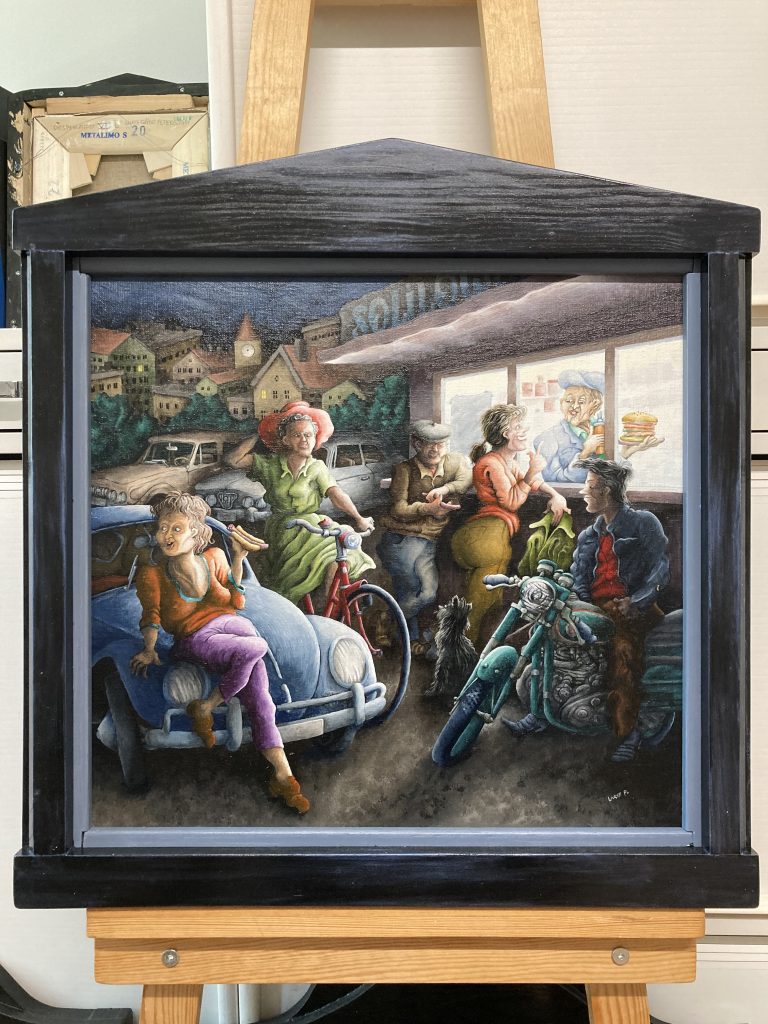 Olja på duk. Såld. Korvkiosk i Jakobsberg med texten Soliloqum (enskilt samtal med sig själv) på sin skylt.