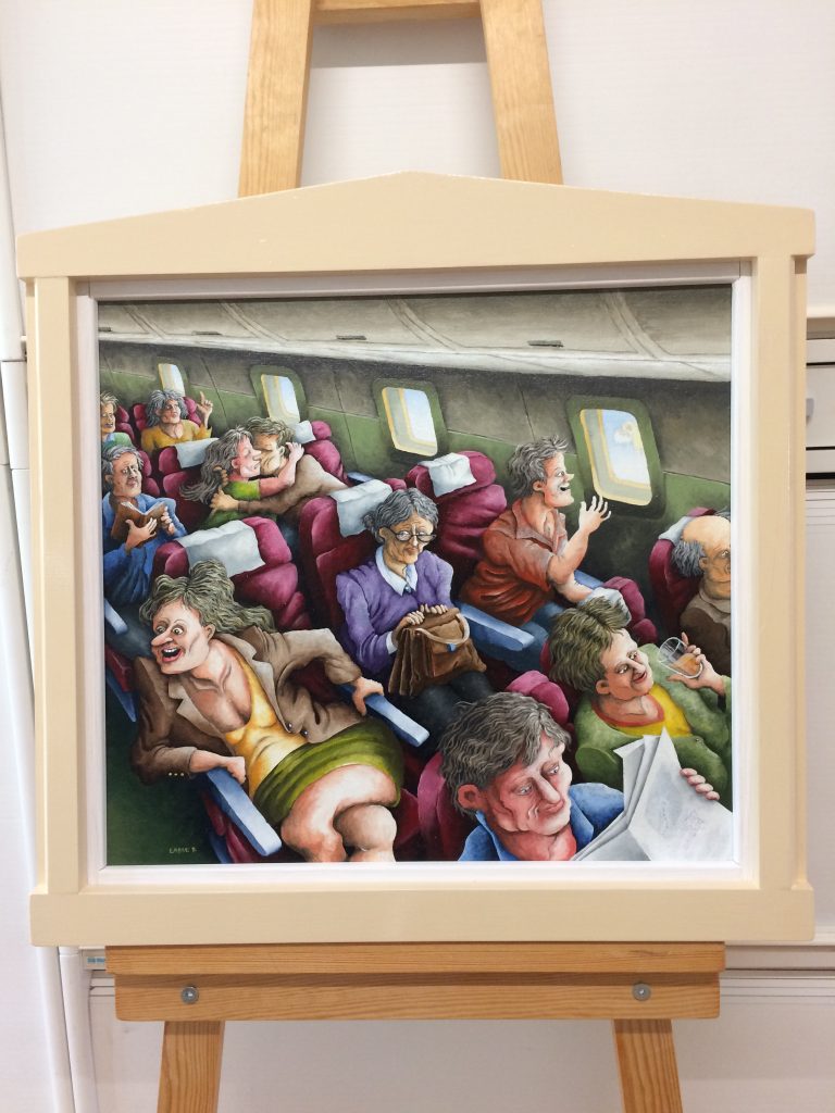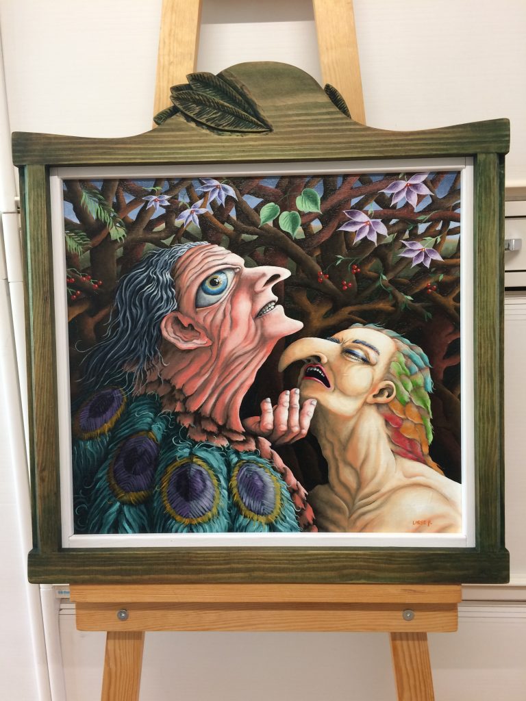 Olja på duk. Pris: 12 000:- Fågelliknande par med påfågelliknande hane orerande med papegojliknande hona