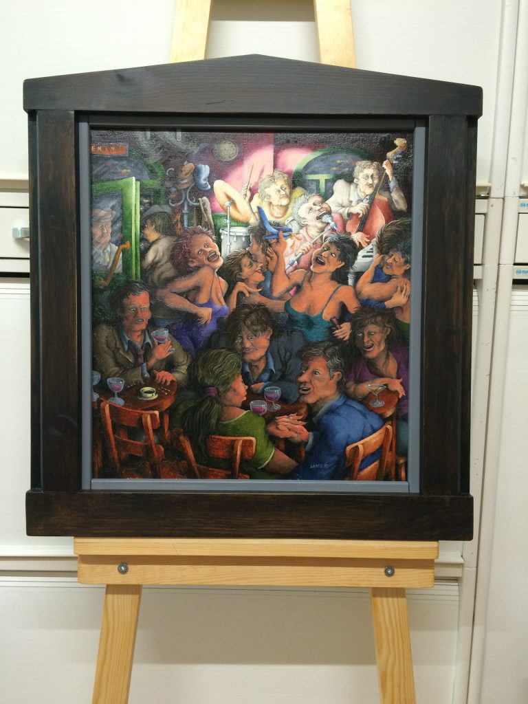 Olja på duk. Pris: 6 000:- Gamla stan i Stockholm. Bandet spelar kanske Bluesuedeshoes